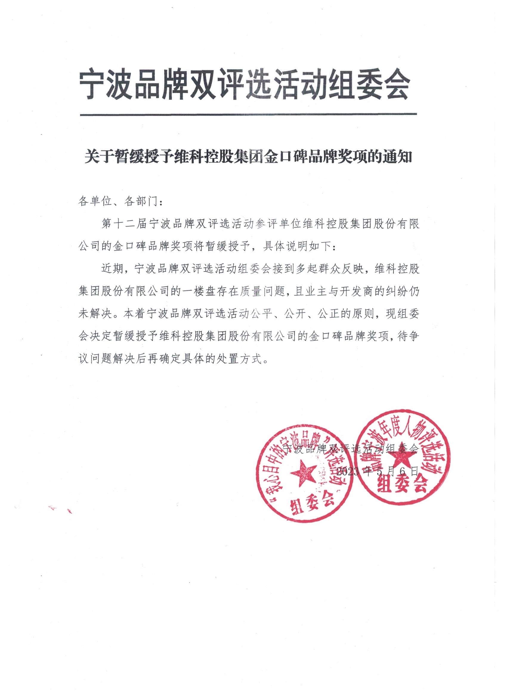 关于暂缓授予维科控股集团金口碑品牌奖项的通知